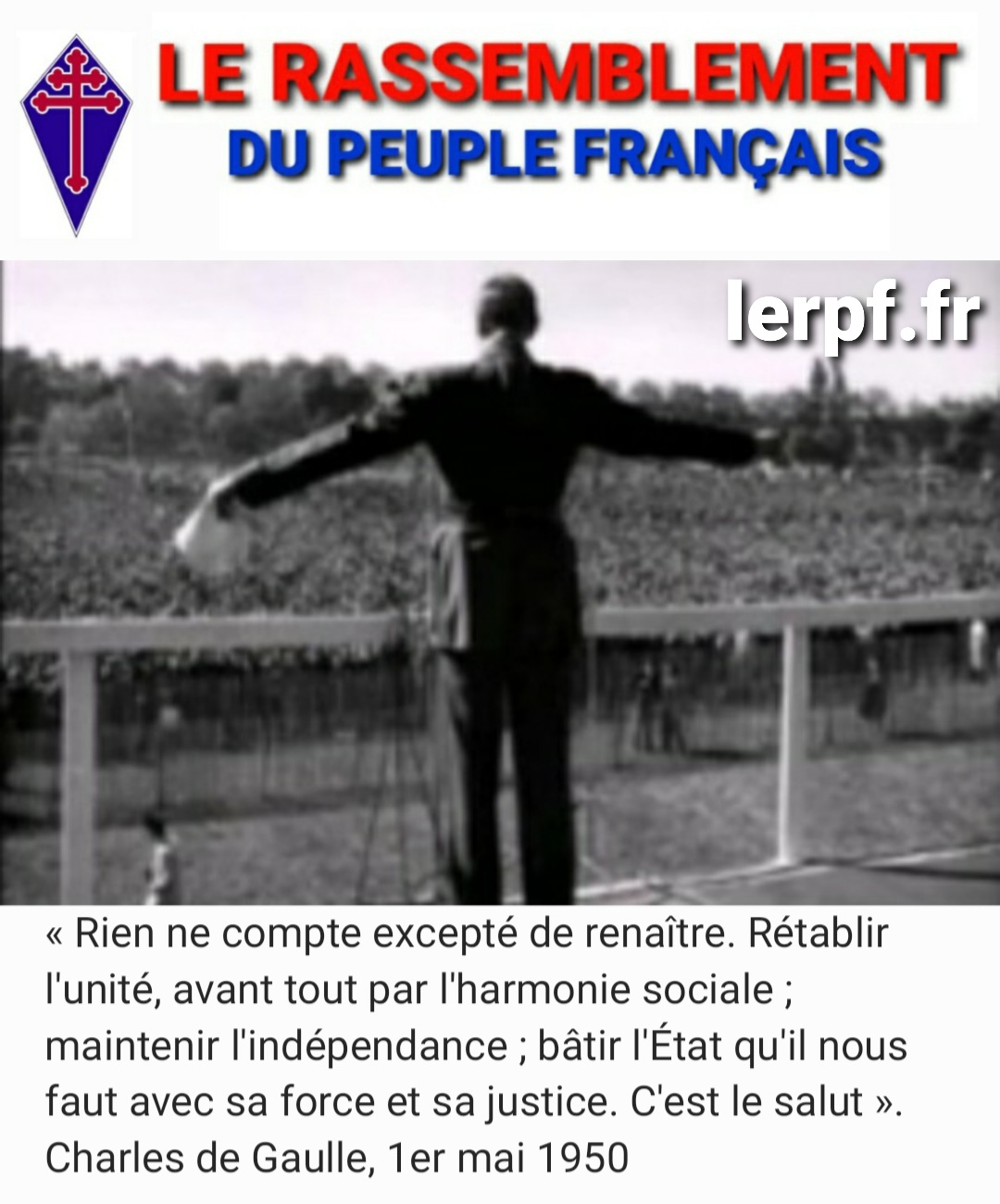 Aujourd’hui, dans le tumulte d’un monde en fusion, au milieu de tant d’appels à la haine ou à la faiblesse, parmi tous les intérêts opposés et embrouillés, moi-même et mes compagnons disons au pays : « Rien ne compte excepté de renaître. Rétablir l’unité, avant tout par l’harmonie sociale ; maintenir l’indépendance ; bâtir l’État qu’il nous faut avec sa force et sa justice. C’est le salut ». Et nous marchons vers le but, sans nous en laisser détourner par aucune combinaison. Nous sommes sûrs qu’à la masse des Français qui nous a déjà rejoints s’ajoutent, pas à pas, beaucoup de ceux qui, d’abord, ne nous entendirent pas ou refusèrent de nous suivre.