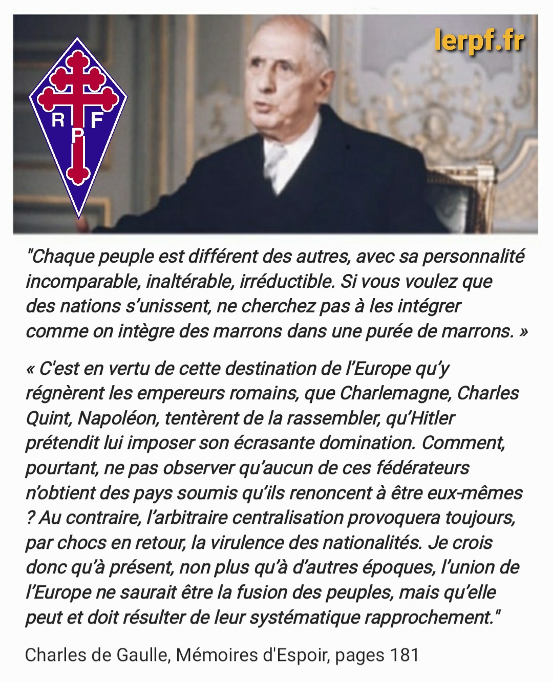 Les élections européennes auront lieux dimanche 9 juin. Beaucoup de personnes nous demandent la position du Rassemblement du Peuple Français (RPF) pour ces élections et quelle consigne le mouvement historique des gaullistes donne !? Notre réponse est simple : le RPF porte la voix de son illustre fondateur or, le général de Gaulle a toujours rejeté l’idée d’un parlement européen élu au suffrage universel et qui de fait imposerait ses lois aux Etats ! Aux yeux du général de Gaulle, le parlement européen ne pouvait être qu’une assemblée composée de représentants des parlements nationaux ! De fait le RPF ne peut donner une légitimité à un parlement supranational en participant de près ou de loin à cette campagne. Qui imagine le général de Gaulle aller voter pour des élections européennes !? La fidélité à l’homme du 18 juin, fondateur de la Ve République, n’est pas modulable à notre sens ! On ne fait pas de gaullisme contre le général de Gaulle ! Le RPF n’a donc aucune consigne à donner à un peuple qui n’a de toute façon pas forcément besoin qu’on lui dise ce qu’il doit faire ! Néanmoins, plus l’abstention sera forte et plus le rejet de cette Europe sera évident !
